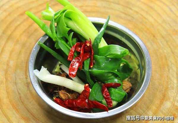 2.盆中放入白芷几片,良姜一块,八角5粒,草果两个,一小把小茴香,几片姜片,一个葱结,青花椒一小把,干辣椒一小把备用。再切点葱花、香菜段备用。