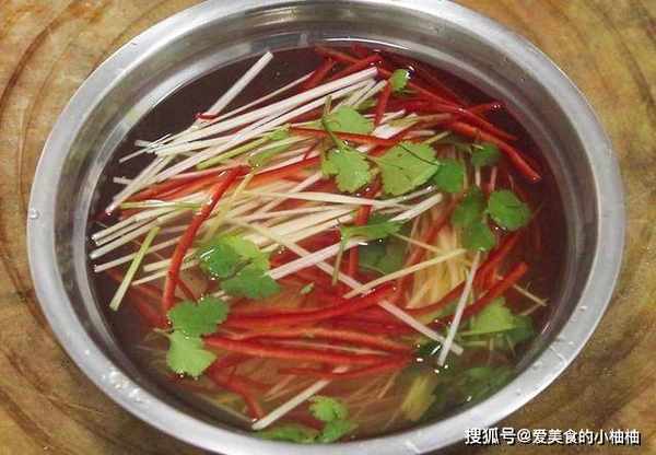 4.大葱白一段,剥去硬芯切成细丝,生姜一块,也切成细丝。红椒一片,去籽后也切成丝。香菜一根,切成小段,全部放在一起,加入清水浸泡,浸泡能去除配菜的浮色和辛辣味,口感更好。