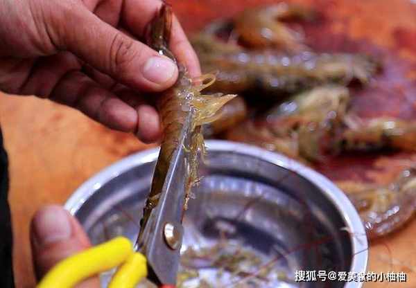 1.准备鲜虾500克,剪去虾须、虾腿,用牙签把虾肉的虾线挑出来,在虾背上划一刀,这样更容易烹熟入味。