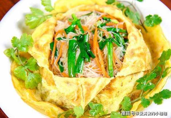8.好了,一道好看又好吃的鸡蛋皮包什锦就做好了。