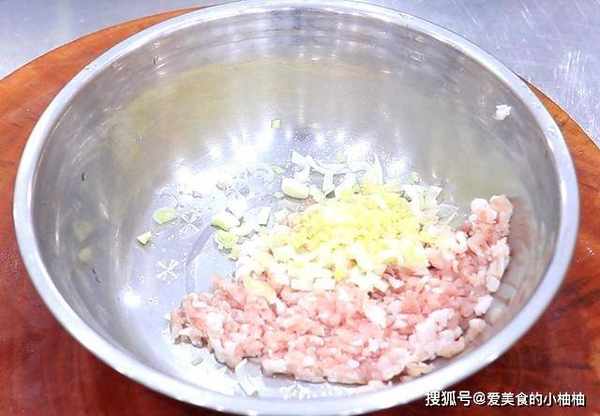 2.准备一小块猪肉,先切成片再剁成肉粒,切点葱花、姜末,和肉馅放在一起,加入食盐1克,胡椒粉1克,生抽5克,用筷子搅匀。