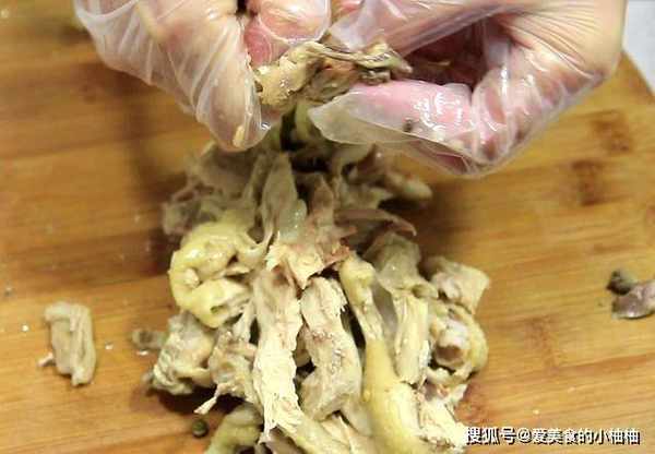 4.15分钟以后能用筷子轻轻穿透,说明已经软烂,取出放入清水中过凉,这一步是为了收紧鸡皮,达到外脆里嫩的口感,鸡肉晾凉以后取出来,用手撕成均匀小块放入盆中备用。