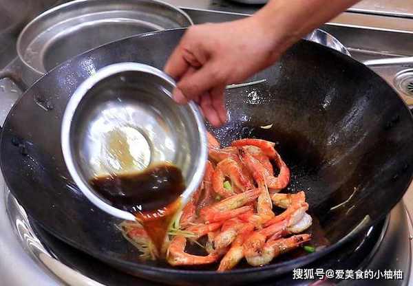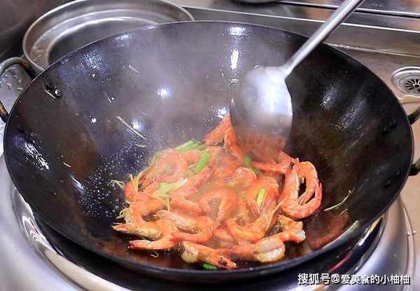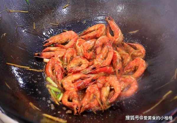 3.锅内加入植物油滑锅,油温五成热时,放入处理好的鲜虾,开小火慢慢煎出虾油,一面煎好以后翻过来煎另一面,大约煎制3分钟,冒出虾油后放入姜、丝和葱段,继续保持小火把葱、姜煎香。