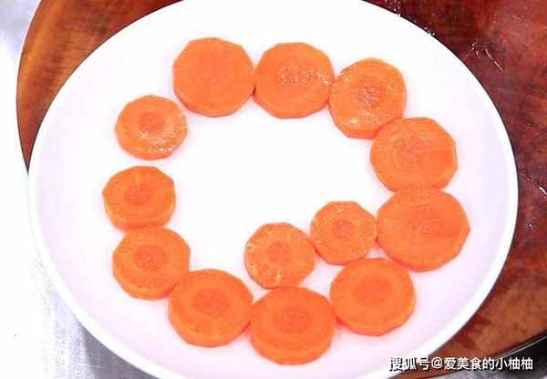3.再准备一根胡萝卜,切成片摆放在盘中备用。再切点蒜末、红椒粒备用。