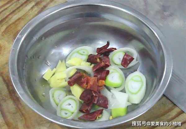 2.准备葱白一段,斜切成圈。生姜一块,切菱形片,再加入一把红干椒备用。
