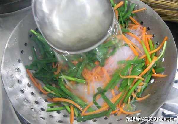 4.锅内加水,水烧开以后先放胡萝卜焯水20秒,再放入韭菜和粉丝翻一下,立即倒出用凉水冲洗,以免粉丝坨在一起。