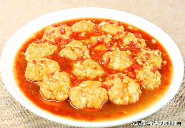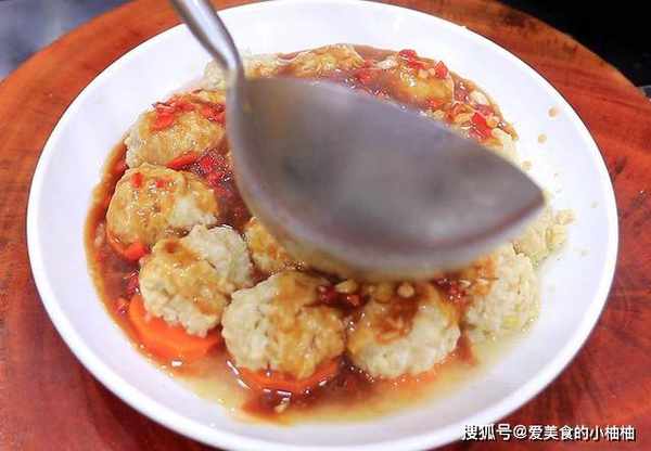 7.15分钟以后,把蒸好的丸子取出来。锅内烧油,油烧热以后倒入蒜末和红椒粒炒香,把调好的料汁倒入锅中搅拌均匀,料汁烧开以后,起锅均匀浇在丸子上面,美味即成。
