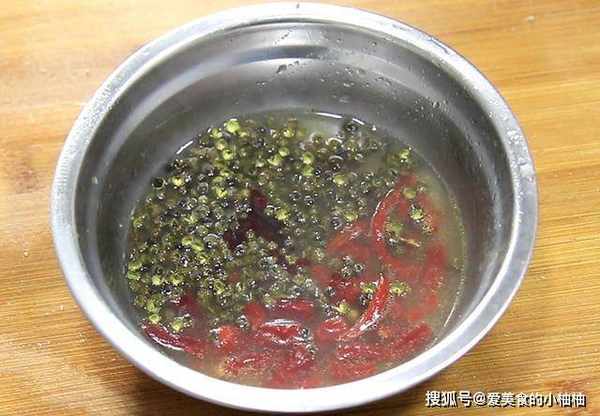 5.挑出香料中的辣椒,切成均匀小段放入盆中,加入青花椒一小把,倒入一勺煮鸡的原汤,加入糖色5克,植物油20克。