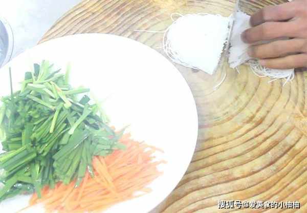 1.准备胡萝卜一个,清洗干净后把外皮削掉,切成细丝备用。韭菜一把,清洗干净,切成3厘米左右的段。粉丝一把,提前用凉水泡2小时,泡好以后控干水分,从中间切上一刀。
