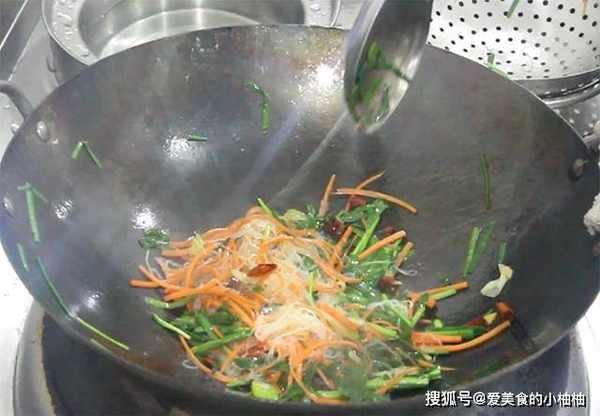 6.锅内烧油,倒入葱、姜、红干椒爆出香味,放入焯过水的蔬菜丝和粉丝翻炒几下,加入适量的生抽,食盐,鸡粉,胡椒粉稍微翻炒几下,化开调料后就可以出锅了。