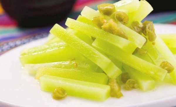 材料:青笋300克,小米辣椒25克,精盐1大匙,味精1/2小匙,花椒粉少许,香油2小匙。