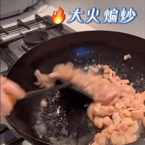 4、锅中烧热之后,来点植物油,油温起来的时候,放入腌制好的鸡肉,开始煸炒,要多炒一会,煸炒之后把它捞出来控干油份。