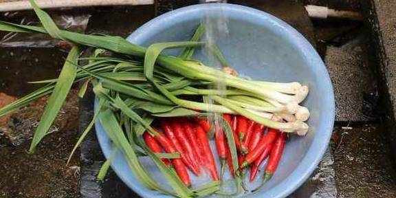 煮的时候不用管,先去准备红辣椒、大蒜苗。