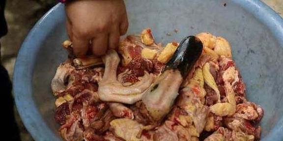 一只大公鸭,养了有八个月之久,再给砍成块。