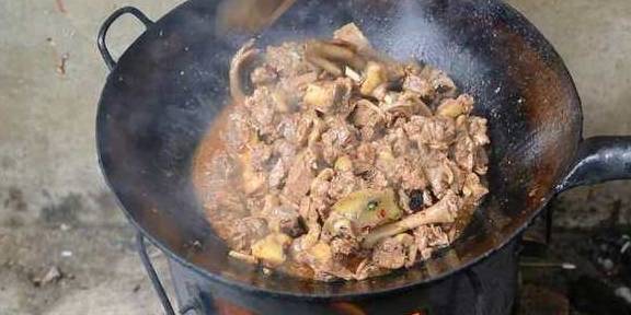 柴火加大火力,锅洗干净,把鸭肉下入锅中。