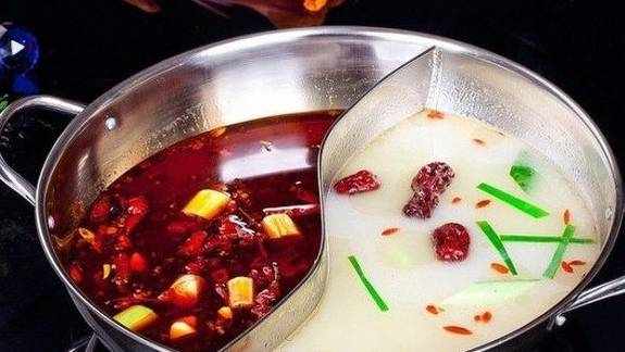 3、把高汤分别倒进红汤、清汤锅,筒骨也可以放进去。图省事,红汤底料我们从超市买的。在汤里加入一些猪油,没有可以省略。可以在红汤里加入辣椒、大葱,清汤里加入枸杞、红枣。