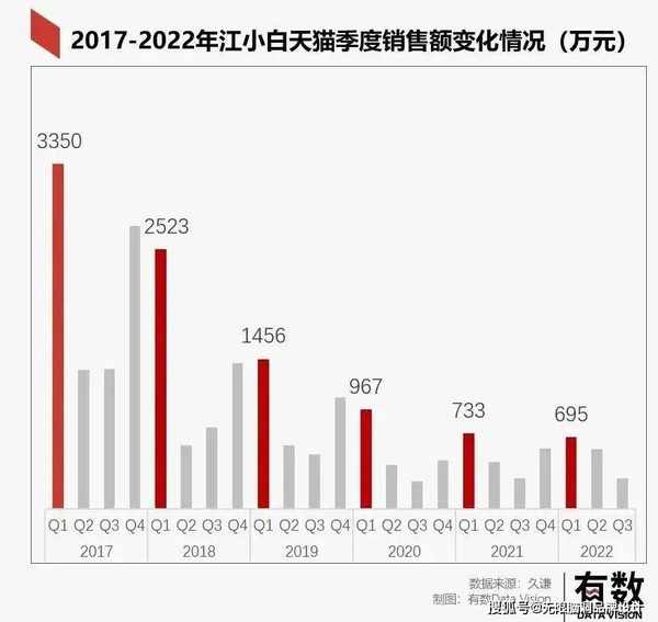 在高歌的第5个年(2018年),市场格外热闹,江小白却出现了瓶颈:先是2018年2019年推出的各种新品不尽如意;接着是2017年开始的销售额下滑趋势明显(此表仅为天猫);甚至2020年2月,江小白销售额创下历史新低,需要发文呼吁消费者购买产品。