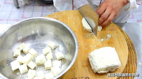 1.首先我们准备一下食材,我们先把老面馒头撕去外皮,然后切成2厘米的方丁备用。