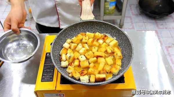 4.下面,我们先把馒头丁煎一下,锅内烧油,油热后,倒入馒头丁,开小火,把馒头丁煎至四面金黄,把表皮煎成金黄色以后,倒入鸡蛋,火不要太大,使锅底均匀受热。
