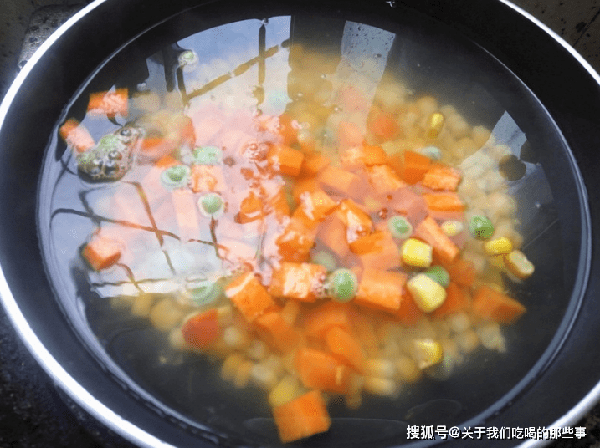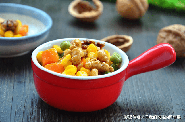 1、玉米剥成粒,洗干净备用。胡萝卜去皮洗干净,切成小块。冻豌豆解冻,核桃剥成核桃仁。碗里加入适量食盐、白糖、淀粉、清水,搅拌均匀备用。