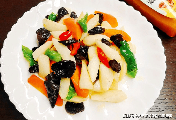 2、起锅烧油,放入胡萝卜片,大火翻炒1分钟,断生后倒入木耳、山药片,继续大火翻炒1分钟。放入青红椒,加入适量食盐、鸡精调味,翻炒入味后即可出锅。