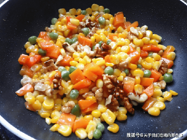 3、起锅烧油,放入葱姜炸香后捞出扔掉,倒入玉米、胡萝卜、豌豆粒,大火翻炒2分钟,倒入料汁翻炒均匀,煮至浓稠后倒入核桃仁,翻炒均匀即可出锅。