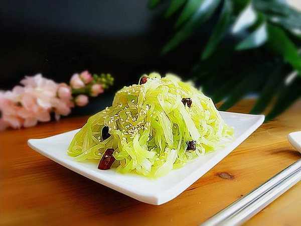 做法:莴笋茎处理好切成丝,不要太细;煮锅烧开水,放入切好的莴笋丝后,再煮开就可以捞出,轻烫一下。晾去热气放入盆中,加盐、白醋和糖拌匀。辣椒切小段,大蒜切末状用热油烫一下,放入拌好的莴笋丝中拌匀,装盘撒芝麻即可。