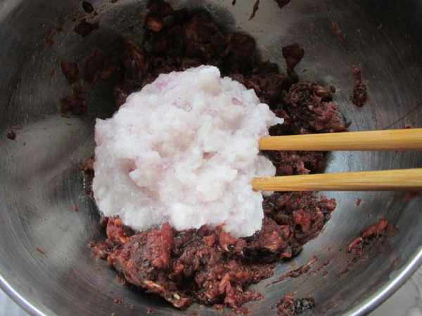 2,洋葱這樣打碎放到牛肉餡中,可以提升餡料的鮮香度,還可以汁水多多。