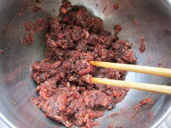 第一步:把牛肉去除筋膜,切成大塊放到料理機中打成肉餡。