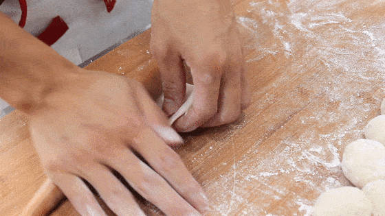 6.把所有的面皮擀好后,我们开始包馅料:如图所示,先把馅料放到面皮上,在从尾部开始向两边捏合,左右交替慢慢的捏成包子形状。