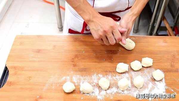 4.在面板上撒上一些面粉,取出发酵好的面团放在面板上,反复揉搓后揉成长条,再分成大小均匀的剂子。
