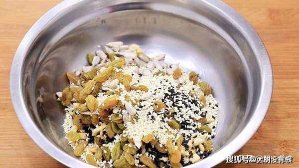准备食材:面粉300克、葡萄干、花生仁、瓜子仁、黑芝麻、白芝麻、白糖。