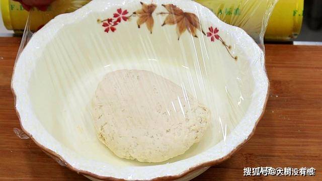 1.首先我们准备一个小盆,放入面粉300克、酵母3克、无铝泡打粉2克,然后在加入40度以下的温水,用筷子搅拌成面絮,再揉成面团盖上保鲜膜,放到比较温暖的地方发酵1个小时左右。