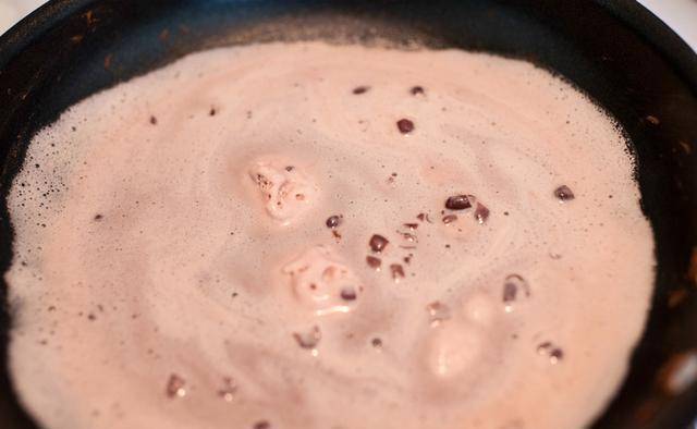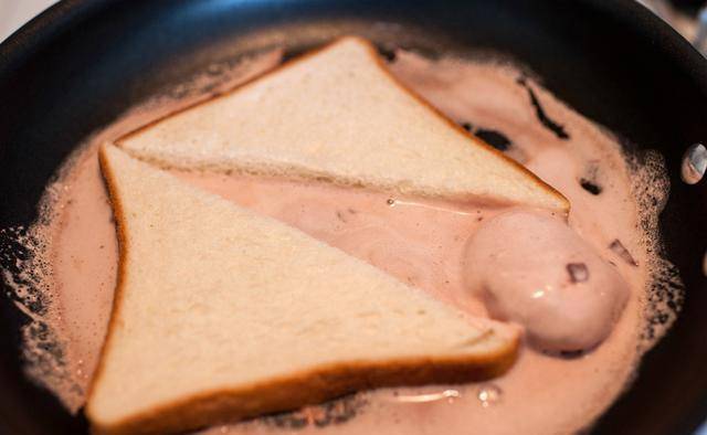 5.待稍微融化后,将吐司放进锅中两面吸收冰淇淋酱汁