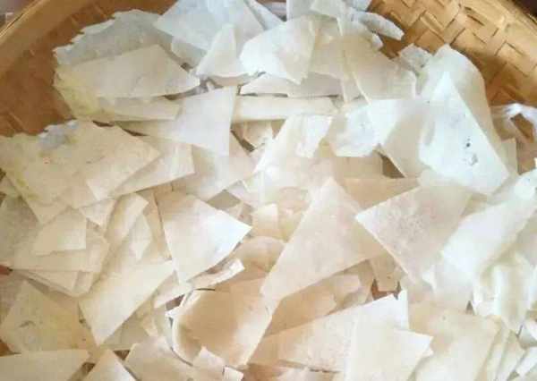 烤法则是将米浆倒进鼎(铁锅)烘烤成薄片,烤好的粿皮掀起来收烟,挂到竹竿上晾干,切成菱状的小块。