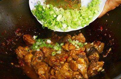 掀开锅盖后加入芹菜、葱,添加太白粉水(水与太白粉3:1调匀)勾薄芡,以中火拌炒30秒即完成。