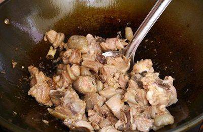 20克油放入锅以中大火热油锅,鸡肉块放入锅,以中火炒2分钟。
