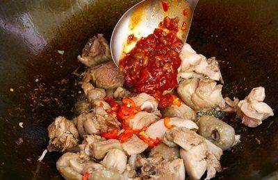 鸡肉变色后,就可将辣椒与辣豆瓣酱放入同一锅中,以中火拌炒1分钟。