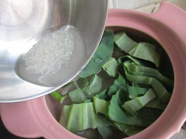第四步:把蓮葉放入,再把清洗乾淨的粳米倒入,粳米也就是我們常吃的大米。
