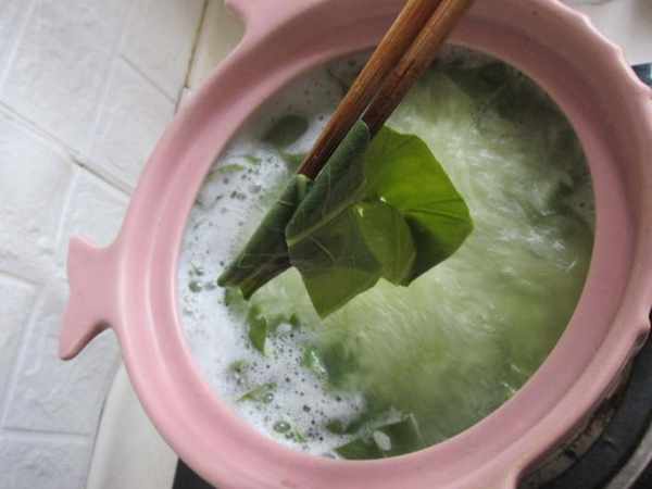 第五步:大火燒開,熬煮10分鐘,這個時候湯已經是綠色的了,把蓮葉撈出去掉。