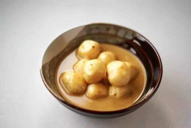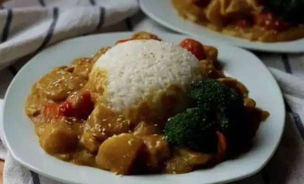 1、椰粉加水调成椰浆,和红咖喱一起在碗中调匀