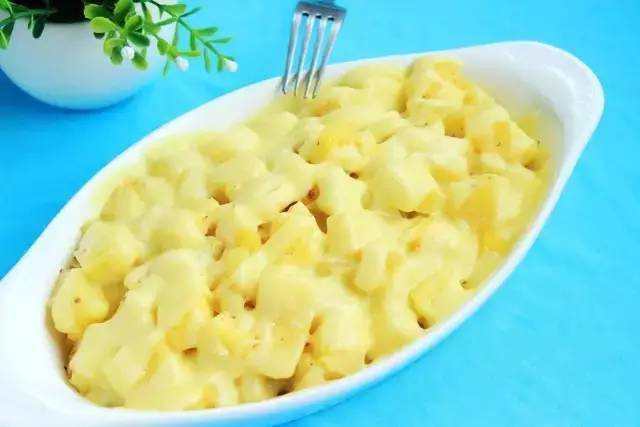 5、拌好的菠萝土豆放入盘中,放上马苏里拉芝士