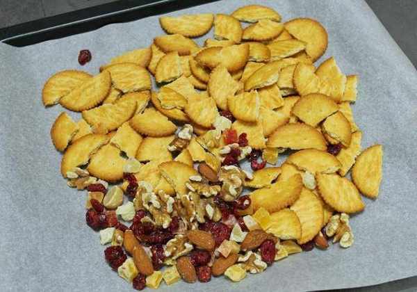 Step4.烤箱预热140度,保温饼干及果干及坚果(有点温度比较容易同棉花糖拌匀)。