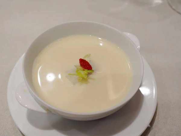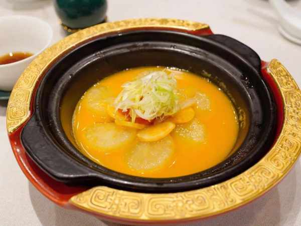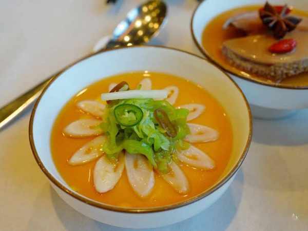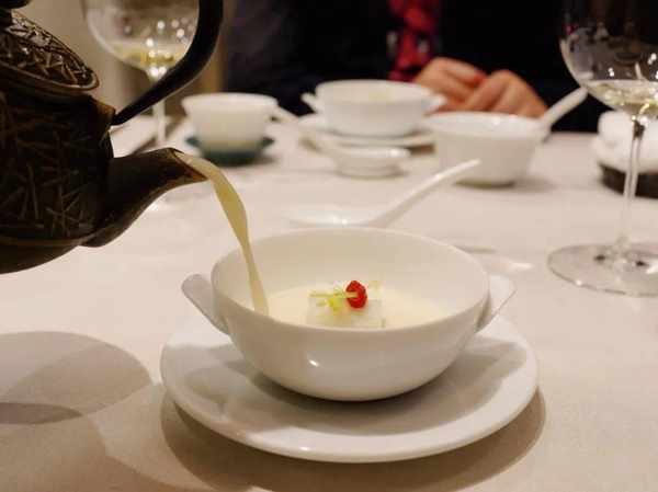 当晚的汤很奇妙,酥糯的淮山打底,加入杏仁熬的鸡汤,鸡汤鲜、杏汁香、蛋白滑,尤其想到这是结合了香港传统的蛋白杏仁茶和杏汁白肺汤,想为厨师的巧思鼓掌。
