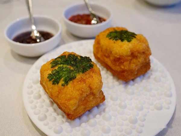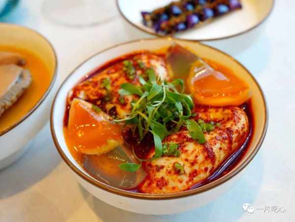 竟然还做臭豆腐!没有绍兴的臭,但是好细腻,酿进了虎虾胶,点缀香菜叶,搭配店里自制的豆瓣和海鲜酱,是华丽版的臭豆腐了。