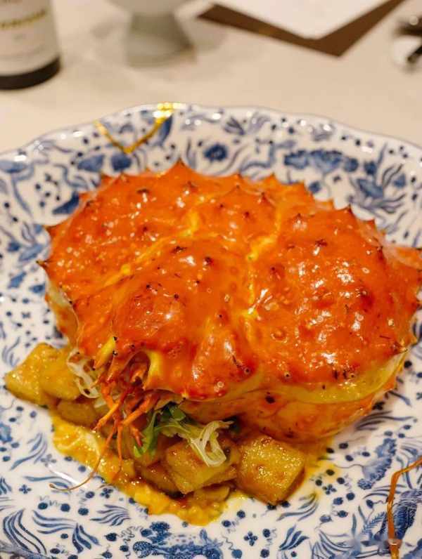 随后呈上阿拉斯加皇帝蟹,红光满堂、内有乾坤,粗壮的蟹脚单吃就很鲜甜,再配上本地膏蟹的蟹粉,感受到蟹鲜的暴击……其实这里不起眼的煎肠粉我更欣赏,煎到焦香,令盘中的蟹味更有层次感,想来跟上海王宝和的名菜“蟹粉炒银皮”是一个道理。