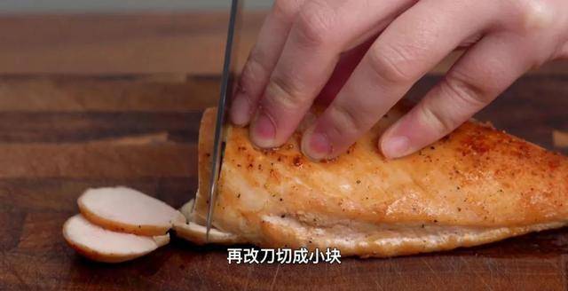 煎好的鸡胸肉切成小块。