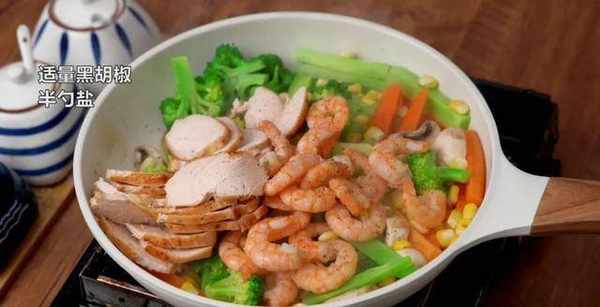 鸡胸肉和虾仁下锅煎熟,撒点黑胡椒和盐调味。