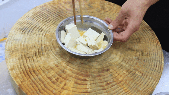 首先准备老豆腐一块,切成均匀的厚片。然后准备一个鸡蛋打入碗中,搅拌打散成蛋液,把豆腐倒进去,让鸡蛋液均匀的裹在豆腐上面备用。