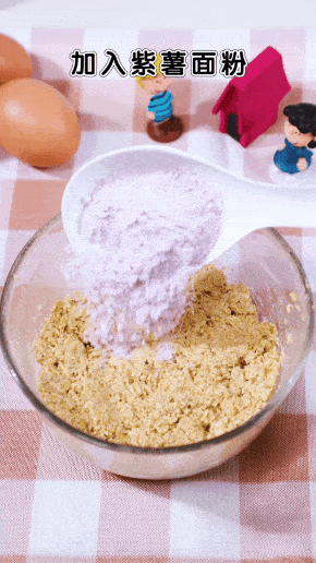 2,加入紫薯面粉和一勺奶粉,继续搅拌,然后把紫薯燕麦糊倒入模具中,整理出形状。